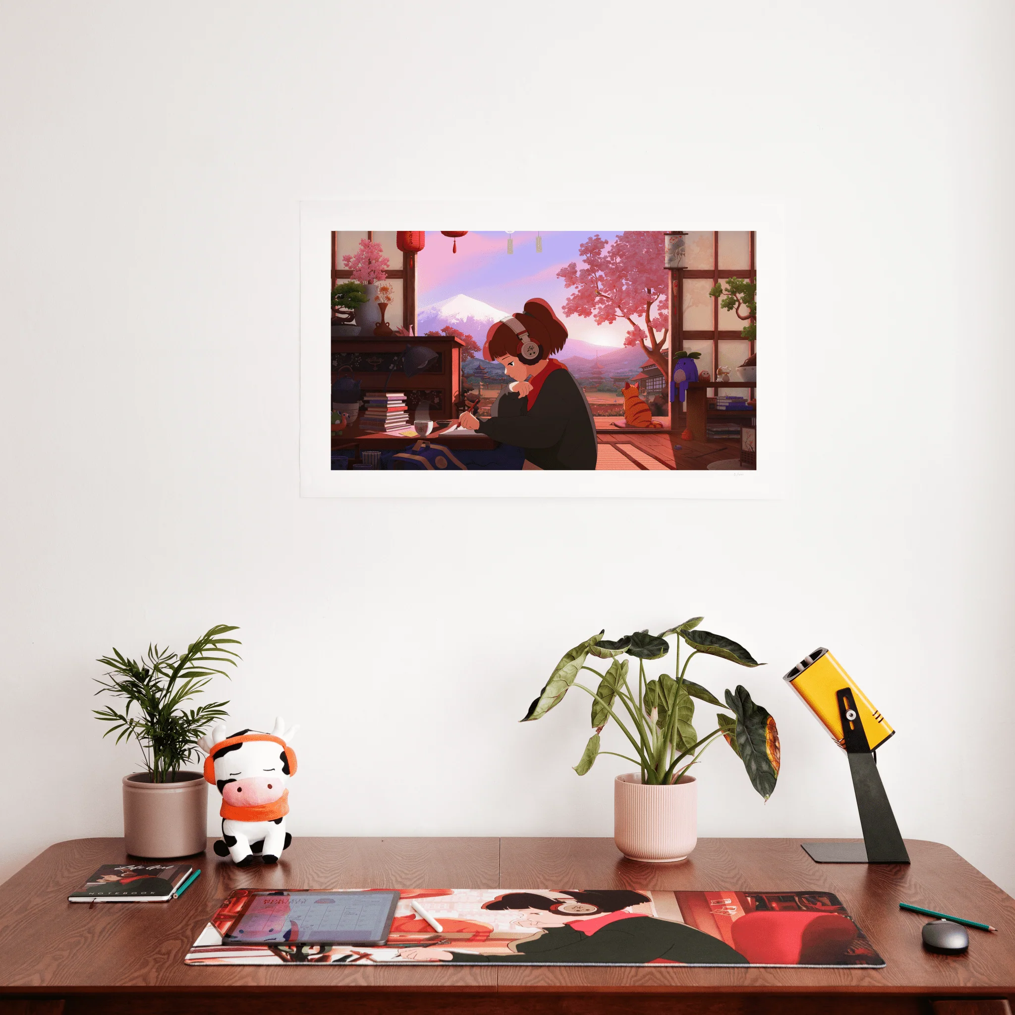 Embrace total serenity with this Collector’s Edition Print, featuring Lofi Girl deep in concentration, surrounded by her loyal companions Cat and Mochi. The soft lighting and gentle details capture a peaceful moment of study — a scene that embodies mindfulness, focus, and quiet creativity.